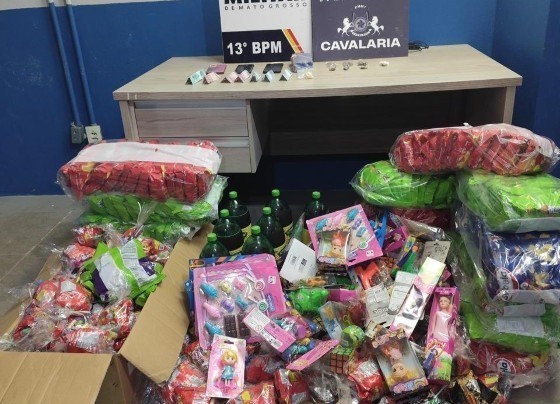 Com os suspeitos, foram encontradas porções de drogas e uma caixa contendo brinquedos, doces e refrigerantes, que, segundo a própria suspeita, seriam distribuídos por uma facção criminosa em comemoração ao Dia das Crianças.