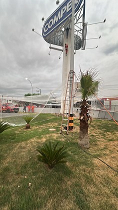 Equipes do Corpo de Bombeiros Militar foram acionadas para atender a ocorrência por volta das 4h30 e seguem realizando negociações para tentar convencer o homem a descer da estrutura com segurança. A Guarda Municipal apoia a ocorrência, isolando a área e auxiliando nas tratativas.
