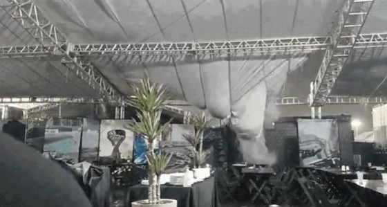 Imagens registradas na última sexta-feira (14) mostram o momento em que a lona de uma área de confraternização no Parque Novo Mato Grosso, em Cuiabá, cedeu sob o peso da água acumulada pela forte chuva durante os treinos da Stock Car, interrompendo as atividades. Felizmente, ninguém se feriu.