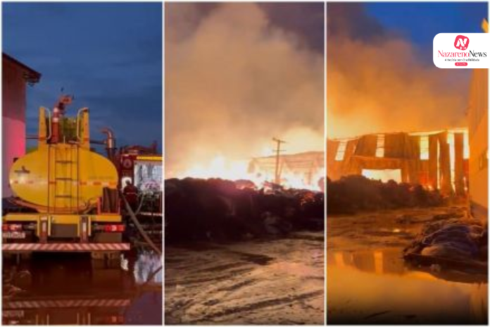 Imagens registradas pelo Corpo de Bombeiros mostram o momento em que o fogo atinge o pátio da empresa e queima todo o algodão armazenado.