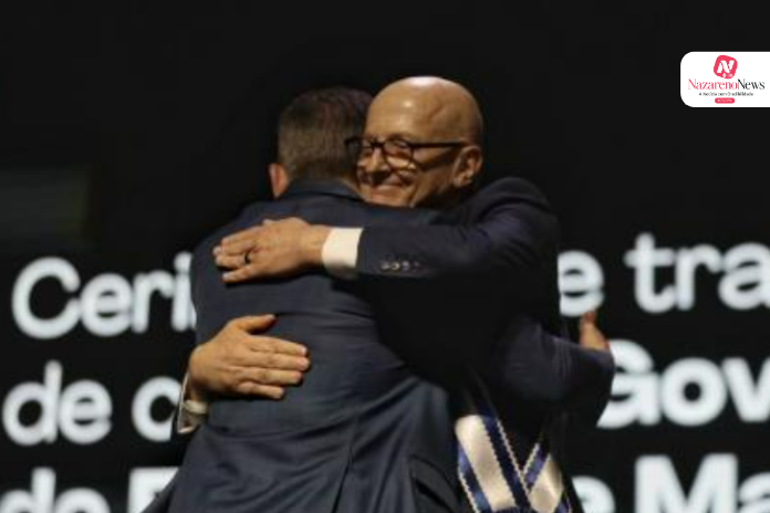 Mauro passa faixa de governador a Pivetta ao som de ‘Amigo de fé’