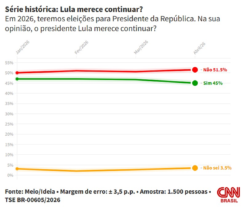 A mais recente pesquisa do instituto Meio/Ideia, divulgada na última quarta-feira (8), aponta que a maioria dos entrevistados não apoia a continuidade do presidente Luiz Inácio Lula da Silva no comando do país. De acordo com o levantamento, 51,5% afirmaram que o atual chefe do Executivo não merece um novo mandato, enquanto 45% se posicionaram favoráveis à permanência. Outros 3,5% não souberam ou preferiram não responder.